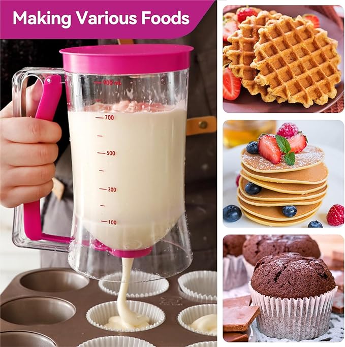 É uma ferramenta essencial para a cozinha, permitindo a criação de uma ampla variedade de receitas, desde cupcakes, panquecas, waffles, tortas e até mesmo molho para pizza. O dispensador adapta-se para garantir que você sempre tenha controle total sobre sua mistura. Se a massa estiver muito espessa, basta adicionar um pouco mais de líquido e funcionará perfeitamente.